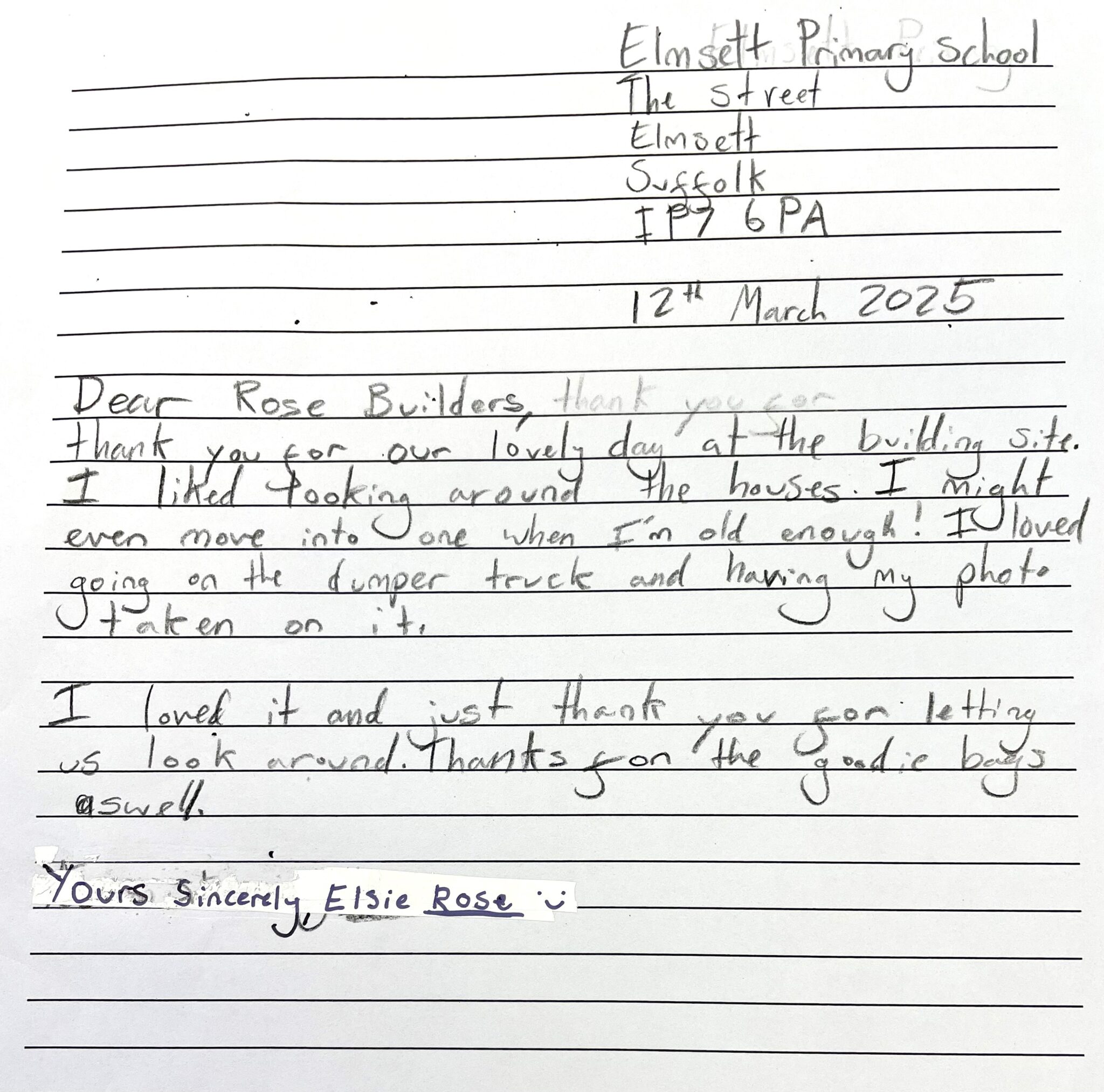 Elmsett pupil Elsie Rose said: “Thank you for our lovely day at the building site.
