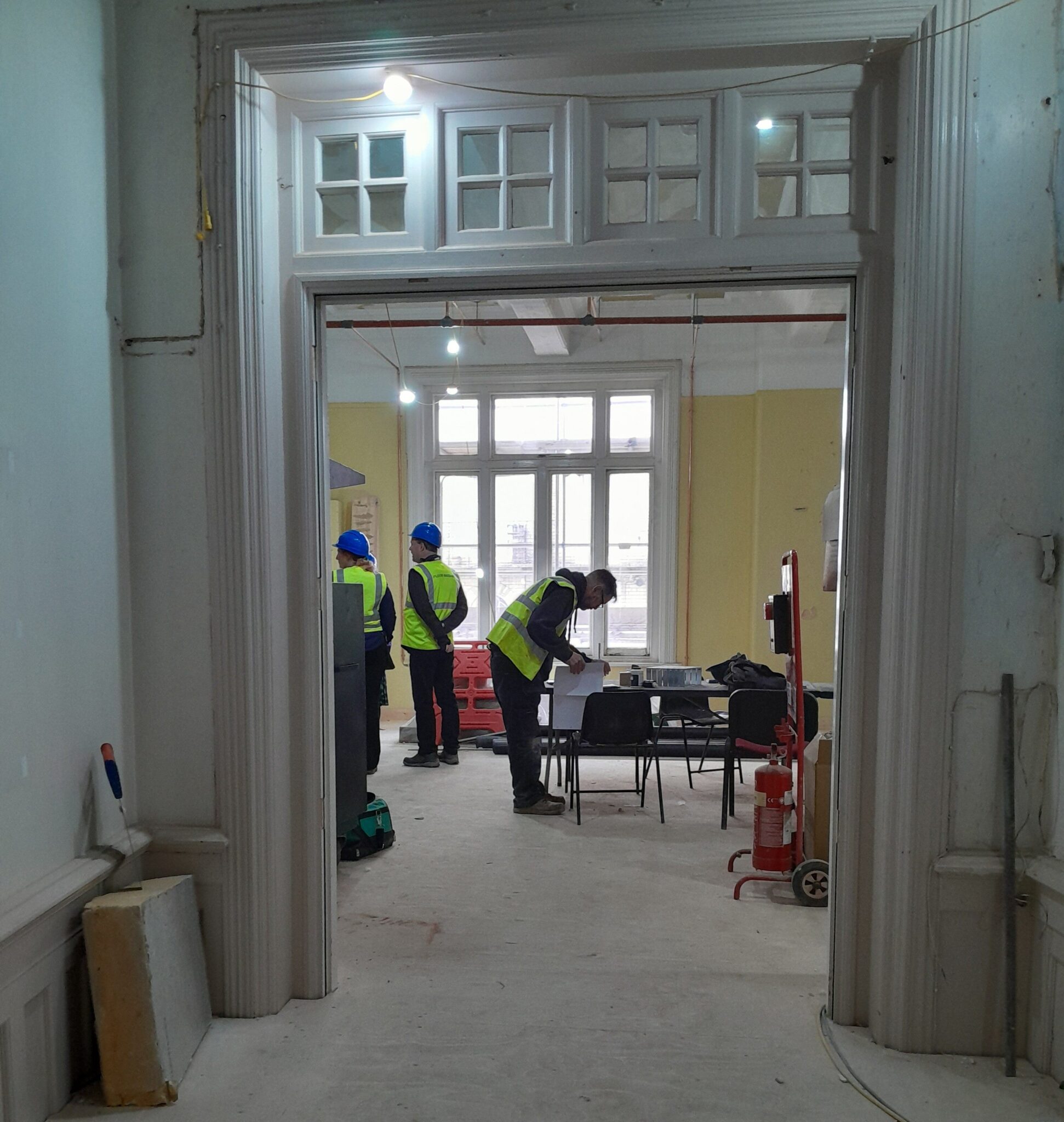 Original features, including cornices, skirtings, floor tiles and floorboards, are being restored along with extensive window repairs which are now reaching completion.